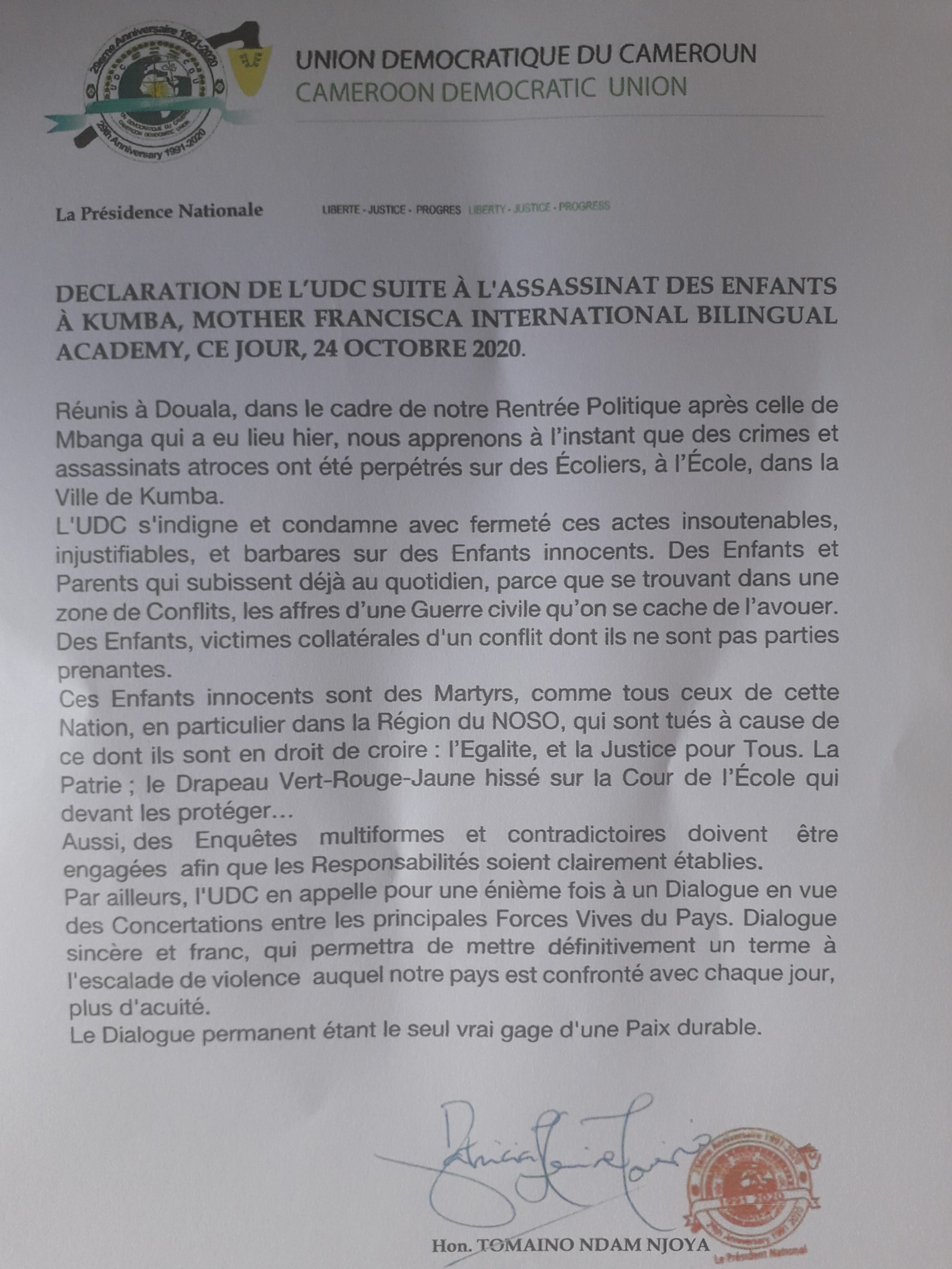 Assassinat des enfants de Kumba : La déclaration de l’Union Démocratique du Cameroun (UDC)