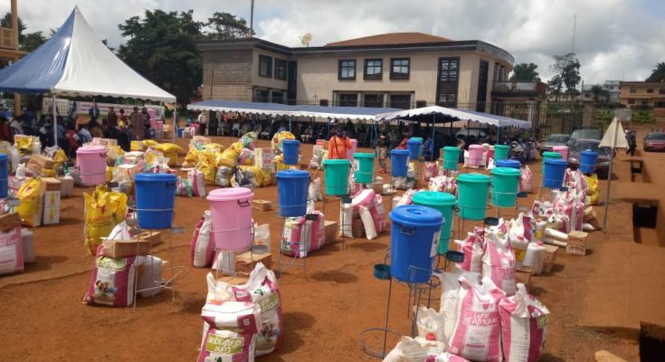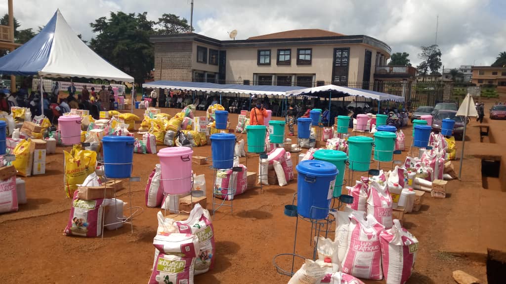 Le 15 Mai 2020, pour la 3eme fois consécutive et dans un intervalle de deux mois, l’esplanade de la mairie de Bangangté a été parée aux couleurs du RIPREM. Les princesses et Reines – Mères du Ndé intensifiaient ainsi leurs soutiens aux populations du département dans la lutte contre la pandémie de covid – 19. Selon la Reine – Mère Charlotte Tchemi représentante du programme, cette phase évaluée à 16 Millions F CFA était constituée de 6000 masques, des cartons de savons, des fontaines pour lave – mains, des gels hydro alcooliques, des cubitainers, et des dons spécifiques dont la distribution des paniers alimentaires pour plus de 1000 familles nécessiteuses. Ces actions sociales du RIPREM marrainées par la première Dame Chantale Biya, entendent renforcer le bouclier anti COVID – 19 autour du département du Ndé encore saint vis-à-vis de cette pandémie.