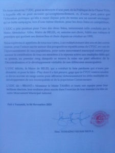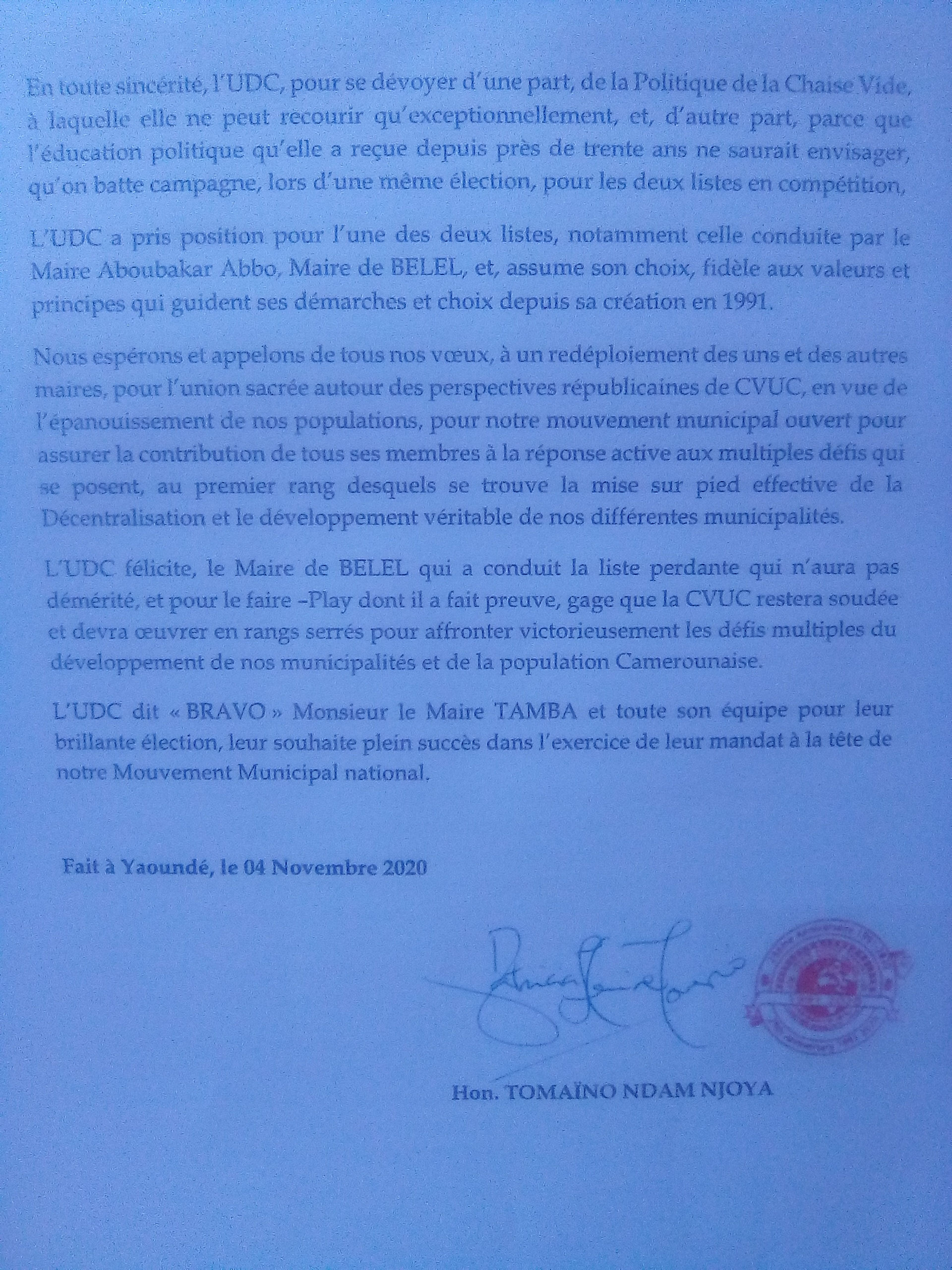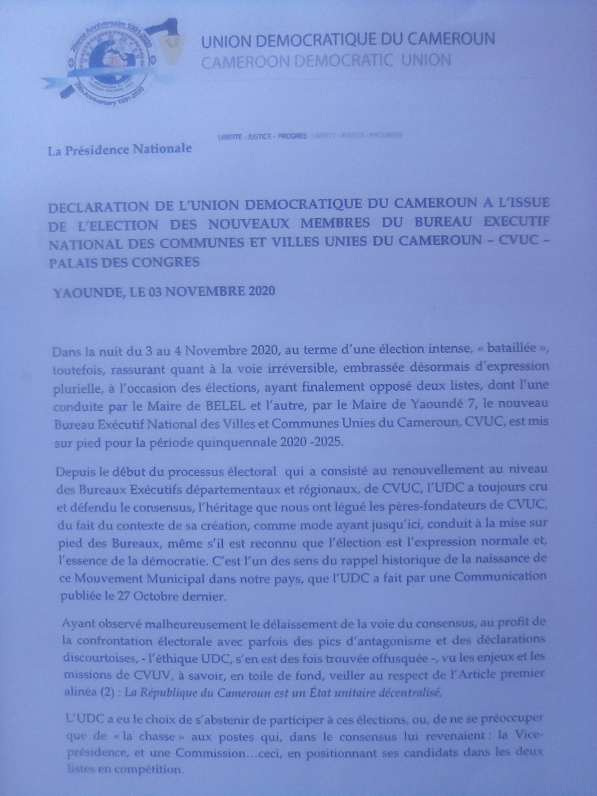 Fidèle à ses principes et à l’esprit fondateur des Communes et Villes Unies du Cameroun(CVUC), l’Union Démocratique du Cameroun(UDC), l’un des acteurs majeurs de la création de cette association des communes, salue l’élection du nouveau bureau national et précise sa position au cours de l’Assemblée Générale élective.