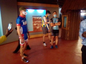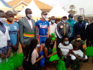 En réalité, deux temps forts ont marqué leur passage dans la ville de Dschang. D’abord la visite du musée des civilisations guidée de main de maître par Flaubert Taboue. Dans une présentation magistrale, le directeur de la structure fera savoir à l’ambassadeur que cet espace créé en 2011 et dont le contenu retrace les origines des peuples du Cameroun et ses 4 grandes aires culturelles, a déjà servi de cadre de recherche d’une dizaine de thèses de doctorat et d’une centaine de masters. La cours de l’Alliance Franco – Camerounaise va abriter la séquence protocolaire de cet événement. Il s’agit de la remise de dons en denrées alimentaires à quelques étudiants de l’Université de Dschang par l’association les Mariannes, des allocutions et de la remise d’un cadeau digne de symbole à l’ambassadeur par des étudiants : Les tiges d’arbre de la paix et un tableau en bois massif  sur lequel sont gravées les images des cyclistes.