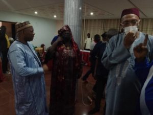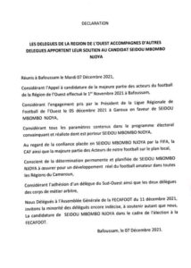 Le candidat Seïdou Mbombo Njoya était à l’Ouest pour recevoir l’onction de ses camarades délégués de l’Ouest à l’AGE du 11 Décembre 2021 à Yaoundé. Il n’y avait pas que les ambassadeurs de l’Ouest ce 07 Décembre à Bafoussam. Le Centre était représenté par l’honorable Bapot Lipot, le Nord par Mme Yvonne ASTA, Felix TABE TABE pour le Sud – Ouest et l’arbitre international Gilbert YAKAM pour le compte de l’ACAF.