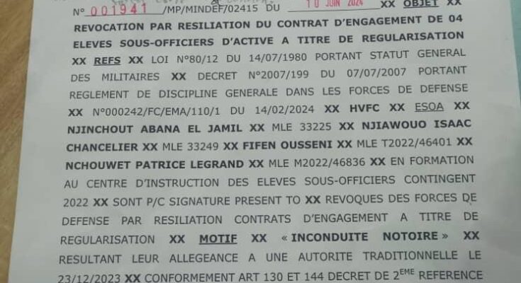 Notons que les élèves de cette vague ont récemment reçu leurs parchemins de fin de formation, au cours d’une cérémonie organisée sur la piste de l’atterrissage du Btap à Koutaba. C’était sous le regard du Général de division Philippe Mpay, Commandant des Ecoles et Centres d’instruction Interarmées. Toujours est il que, certains, soit plus d’une quinzaine de ces jeunes ont échappé à la furie du patron en second des FDS, et seuls(4) quatre identifiés certainement comme étant des organisateurs et meneurs de cet honneur militaire au Fon des Bamoun, le 23 décembre 2023 au palais de Foumban, sont restés sur le tapis.