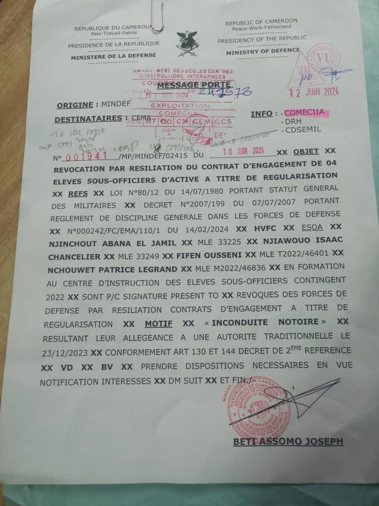 Notons que les élèves de cette vague ont récemment reçu leurs parchemins de fin de formation, au cours d’une cérémonie organisée sur la piste de l’atterrissage du Btap à Koutaba. C’était sous le regard du Général de division Philippe Mpay, Commandant des Ecoles et Centres d’instruction Interarmées. Toujours est il que, certains, soit plus d’une quinzaine de ces jeunes ont échappé à la furie du patron en second des FDS, et seuls(4) quatre identifiés certainement comme étant des organisateurs et meneurs de cet honneur militaire au Fon des Bamoun, le 23 décembre 2023 au palais de Foumban, sont restés sur le tapis.