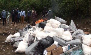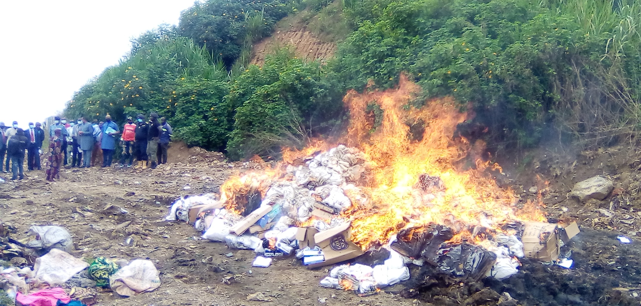 6000 flacons de Benzathine Benzile Pénicilline en injection, 1500 flacons de sirops, 130 cartons de cigarettes non estampillés et 1 200 000 pièces d’emballages plastiques non biodégradables. Ainsi, le butin de chasse des éléments du secteur des Douanes de l’ouest qui ont été détruits et passés à la flamme sous la coordination de la commission régionale de la lutte contre la contrefaçon et la contrebande présidée par le gouverneur, représenté à l’occasion par l’Inspecteur Général des services régionaux, Adrey EPENTE TAZEU.