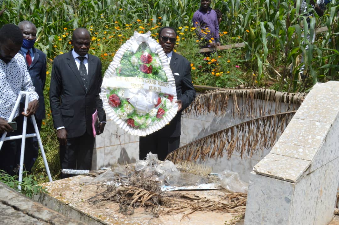 Pr Shanda Tonme et sa suite seront ensuite reçus par le maire de la ville, Roger Tafam. Objectif : le féliciter pour son élection et solliciter la clé de la cité qui abrite les restes d’Ernest Ouandié et de ses compagnons. Après cette civilité, le cap est mis sur le quartier Plateau. Le sépulcre du combattant Upciste est situé en contrebas de l’EEC. L’hommage rendu à Ernest Ouandié est adressé à tous ceux qui ont donné de leurs vies pour le Cameroun. Voix étranglée par des sanglots retenus, des larmes ruisselant de ses yeux, la gerbe de fleurs serrée contre son visage, Pr Shanda Tonme s’est fait porteur d’un message de pardon, socle d’une véritable réconciliation, loin des discours victimaires, accusatoires et vengeurs qui ont toujours plu sur la tombe du nationaliste. « Les camerounais ont donné de leurs vies. Nous pensons à Douala Manga Bell, Martin Samba, Ruben Um Nyobe Félixe, Roland Moumié, Kingué, Bebey Eyidi, et tous les autres. Nous pensons au Pr Albert Eyinga qui a fait le choix de revenir mourir dans son pays. Nous sommes venus vous dire d’oublier tout ce sacrifice et de reposer en paix car à la fin, c’est du Cameroun qu’il est question. Nous ne pouvons pas nous nourrir de vengeance ». D’où la lecture de la loi n° 91/022 du 16 décembre 1991 portant réhabilitation de certains figures de l’histoire du Cameroun et copie posée sur la gerbe de fleurs.