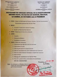 Le programme des obsèques officielles du sultan SM Ibrahim Mbombo Njoya est en circulation. Le magistrat municipal de Foumban écarté par les organisateurs. Le préfet du Noun y a souscrit.