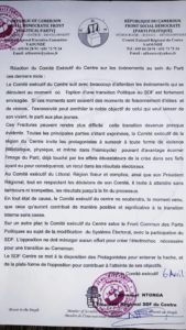 Dans le communiqué final des travaux de son comité exécutif tenu ce 6 Avril 2021 à Yaoundé, le SDF de la région du Centre se prononce sur la guéguerre qui  clive le parti. Emmanuel NTONGA, président régional et ses camarades entendent aussi contribuer activement à «  l’atteinte des objectifs » de la dynamique de l’opposition lancée le 1er Avril 2021.
