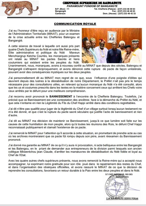 Lire la communication royale qui a sanctionné la rencontre entre le MINAT et quelques chefs traditionnels du Ndé. Il apparait tout de même  comme une réaction  à la requête des notables Balengou.