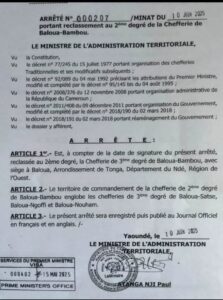 Cet arrêté du MINAT, consacre l’indépendance du village Baloua vis-à-vis du groupement Bandounga, chefferie de 2ème dégré.