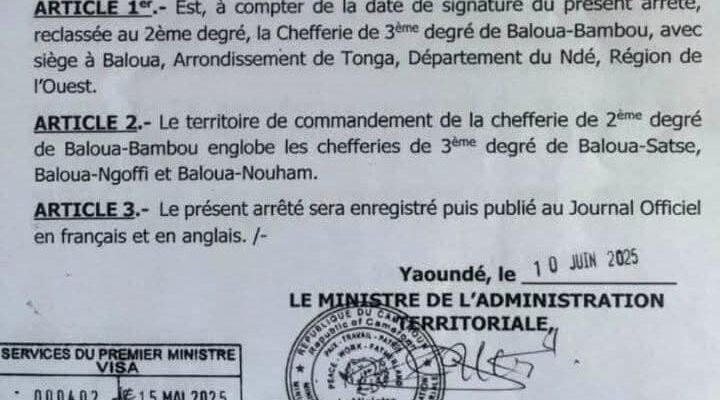 Par un arrêté en date du 10 Juin 2025, le Ministre de l’Administration Territoriale reclasse la chefferie de 3ème degré de Baloua – Bambou au 2ème degré avec pour siège à Baloua. Le territoire de commandant est aussi défini. Le nouveau Baloua – Bambou est ainsi composé des chefferies de 3ème degré de Baloua – Satse, Baloua – Ngoffi et Baloua – Nouham, créées par des arrêts préfectoraux.
