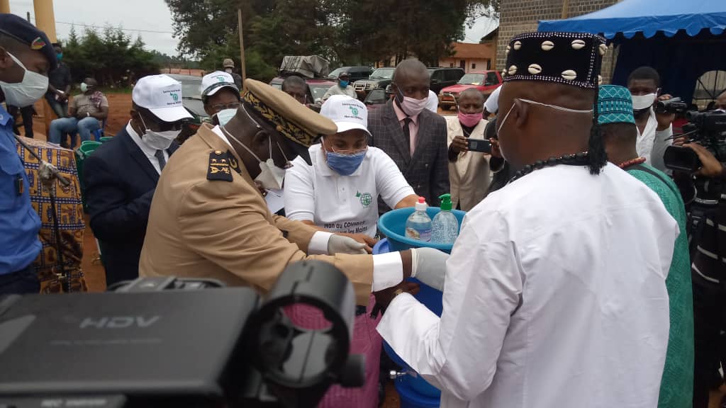 50 Millions de FCFA, c’est le budget arrêté par le Réseau International des Princesses et Reines Mères du Ndé pour constituer le bouclier anti coronavirus sur toutes les frontières du département. 20 Millions CFA déjà réunis ont été investis dans l’acquisition d’importants matériels dont la remise aux bénéficiaires, a fait l’objet d’une cérémonie organisée le Jeudi 09 Avril 2020 à l’esplanade de la mairie de Bangangté. Pour ce premier stock de dons, le RIPREM a ciblé les 14 groupements et les formations sanitaires du département du Ndé. Ainsi, à la première catégorie représentée par les chefs supérieurs, l’équipe en charge des opérations a offert : 325 bacs à eau pour lave – mains, une trentaine de cartons de savons, une centaine de ballots de serviettes jetables, plus de 1000 solutions hydro – alcooliques et bien d’autres accessoires « C’est pour la première fois qu’un élan de solidarité et de générosité de cette envergure est exécuté dans le Ndé pour les populations du Ndé » a martelé S.M Tchada Ngapmou Louis de Bandounga, porte parole des autorités traditionnelles sous le regard et sourires approbateurs de madame Charlotte Tchemi, représentante de la présidente du RIPREM qui, dans son discours de circonstance a indiqué que l’opération ainsi lancée sera pilotée par un noyau constitué de Reines Mères, membres du RIPREM avec la participation qui se veut active des maires, des chefs supérieurs, des chefs de villages, des comités de développement, des regroupements jeunes et de la société civile. Les formations sanitaires conduites par le médecin chef de district de santé ont reçu entre autres des thermos – Flash laser, des combinaisons de protection.
