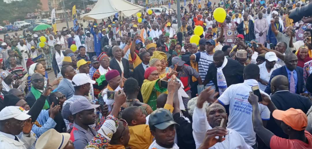 Grande entrée dans l’esplanade du stade omnisports Ahmadou Ahidjo, ce 27 septembre 2025, jour du lancement officiel de la campagne pour la présidentielle du 12 Octobre 2025. Le candidat de l’UDC était accompagné des responsables ou représentants de la quinzaine de partis politiques, dont trois (3) candidats recalés ; et ceux des OSCs qui ont rallié sa candidature. On peut noter entre autres, Chantal Roger Tuile ; chantal kambiwa qui était déjà dans la tournée européenne du candidat ; la représentante de Mme Eteki Otabela, Jestel Shewa ; Dr Ayissi ; Hilaire Nzipang, le fidèle partenaire politique de feu Dr Adamou Ndam Njoya, fondateur de l’UDC. Chacun d’eux a pris la parole pour expliquer les motivations de son choix porté sur le porte fanion de l’Union Démocratique du Cameroun et l’unique femme des 12 candidats.