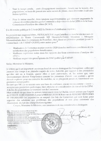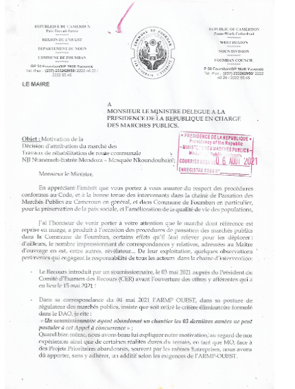 Dans une correspondance en date du 11 Mars 2022, le Ministre Talba Malla sanctionne les maires de Foumban, Banka et Bafang. Chose curieuse, au nom d’une même entreprise : Ets Prefa BTP.