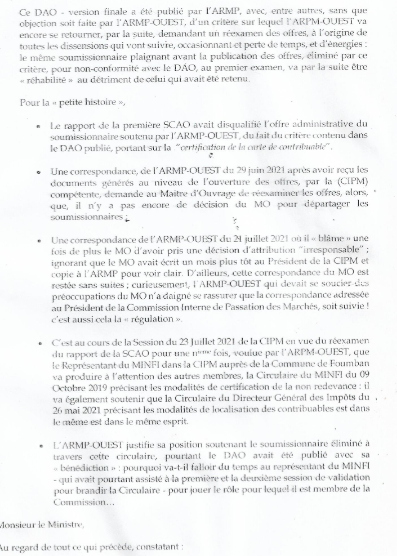 - Face aux deux propositions d’attributions, qui m’ont été portées, (je n’ai jamais participé à une seule des Assises du CIPM), Assises bien que, de tout temps et difficilement du fait de nos moyens limités supportées par la Commune et après avoir perdu deux mois, multiplié les dépenses, pour qu’à tout prix, l’ARMP Ouest « positionne » son Protégé », le Maitre d’Ouvrage a choisi la proposition qui lui convenait en prenant soin de motiver au Ministre son choix.