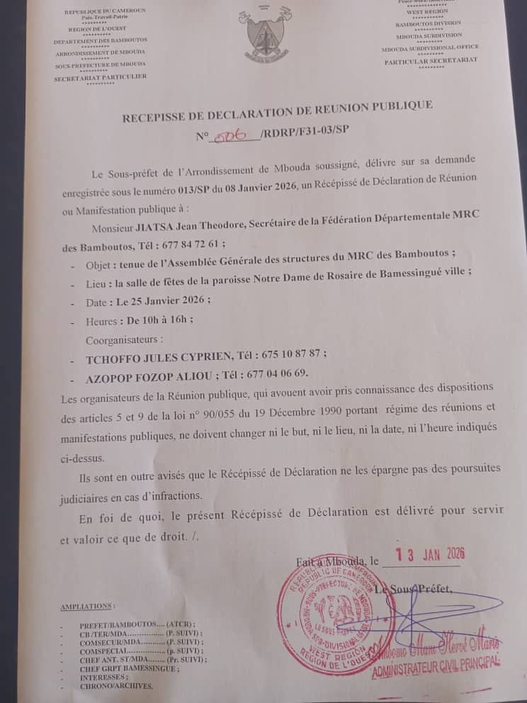 L’authenticité de ces images virales est confirmée par un responsable local du MRC. Ce brouhaha d’un autre âge suivi d’une brutalité inouïe, se passe le 25 Janvier 2025 à Mbouda, alors que les membres des structures de la Fédération Départementale MRC des Bamboutos, étaient réunis dans le cadre de leur traditionnelle assemblée. Ils sont brusquement stoppés par ces jeunes qui d’un coup se réclament militants du MRC, d’un autre, des « hommes en tenue », nous rapporte notre source. Notons que cette assemblée avait été déclarée par le départemental de ladite Fédération et récépissé obtenu du sous préfet de Mbouda (voir document ci- dessus).