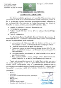 C’est la substance de la lettre de démission du président de Djiko FC de Bandjoun, des activités de football. Notons qu’il fut l’un des grands soutiens, défenseurs et protecteurs de l’actuel président de la Fédération Camerounaise de Footbal (FECAFOOT). On serait tenté de dire que le bâteau Eto’o se vide chaque jour.