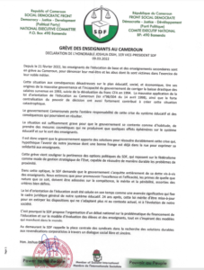 La grève des enseignants se radicalise chaque jour et le gouvernement donne les signes d’un décideur débordé par la situation. Même la dernière « Très haute instruction du Chef de l’Etat » n’aura été qu’une mesure cosmétique que d’aucuns ont qualifiée d’acte de provocation. A travers une déclaration,  Social Democratique Front (SDF) propose des réformes