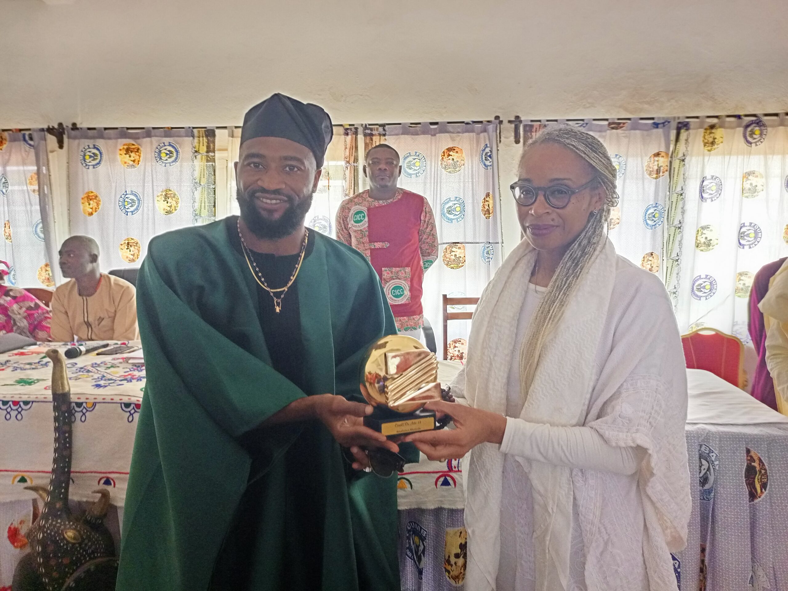 C’est dans cette ambiance au parfum du Café camerounais que l’artiste Fadyl le sorcier et sa suite ont été reçus dans la salle des délibérations de l’hôtel de ville de Foumban, par l’édile. « Nous sommes venus vous présenter le trophée et prendre la bénédiction de la ‘’Mère – Maire » pour la suite de la carrière du fils… » a déclaré le porte parole de l’artiste . Ils sont aussi venus marquer leurs reconnaissances à Madame de la commune Foumban pour son combat en faveur de la culture Bamoun et pour son engagement dans la promotion du café camerounais en général, et celui du Noun en particulier, a t- il ajouté.